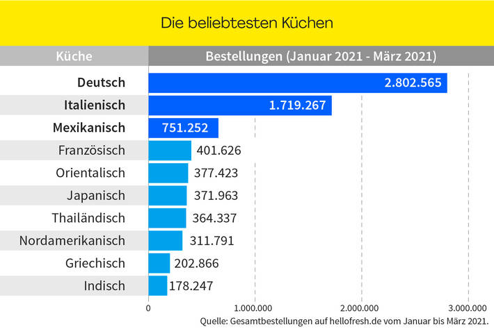 Die mit Abstand beliebteste Küche ist die Deutsche. Zwischen dem Januar und März 2021 wurden über 2,8 Mio deutsche Gerichte bei uns bestellt. Mit über 1,7 Millionen Bestellungen erfreut sich die italienische Küche weiterhin großer Beliebtheit und landet auf dem zweiten Platz im Ranking. Mexiko kann mit seiner kulinarischen Vielfalt den dritten Platz für sich behaupten, vor vielen europäischen und asiatischen Küchen.