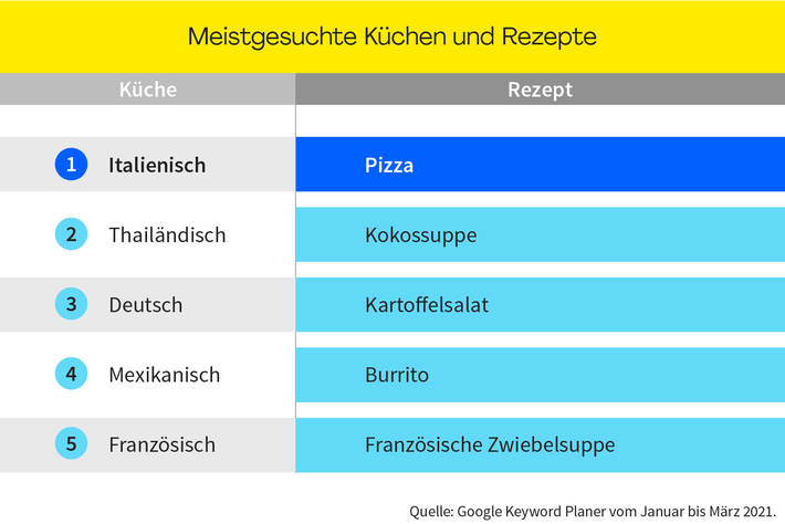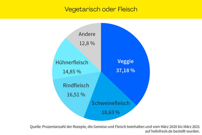 Zur Datenerhebungen haben wir die Bestellungen auf hellofresh.de zwischen Januar und März 2021 analysiert und dargestellt. Das Interesse an Küchenstilen und Rezepten haben wir mit dem Google Keyword Planer auf der Basis von Suchvolumen zwischen Januar und März 2021 analysiert. Wir haben Google Trends verwendet, um das Interesse für die Suchbegriffe "vegane Rezepte" und "vegetarische Rezepte" im Zeitraum 05.2020-05.2021 in Deutschland zu finden.