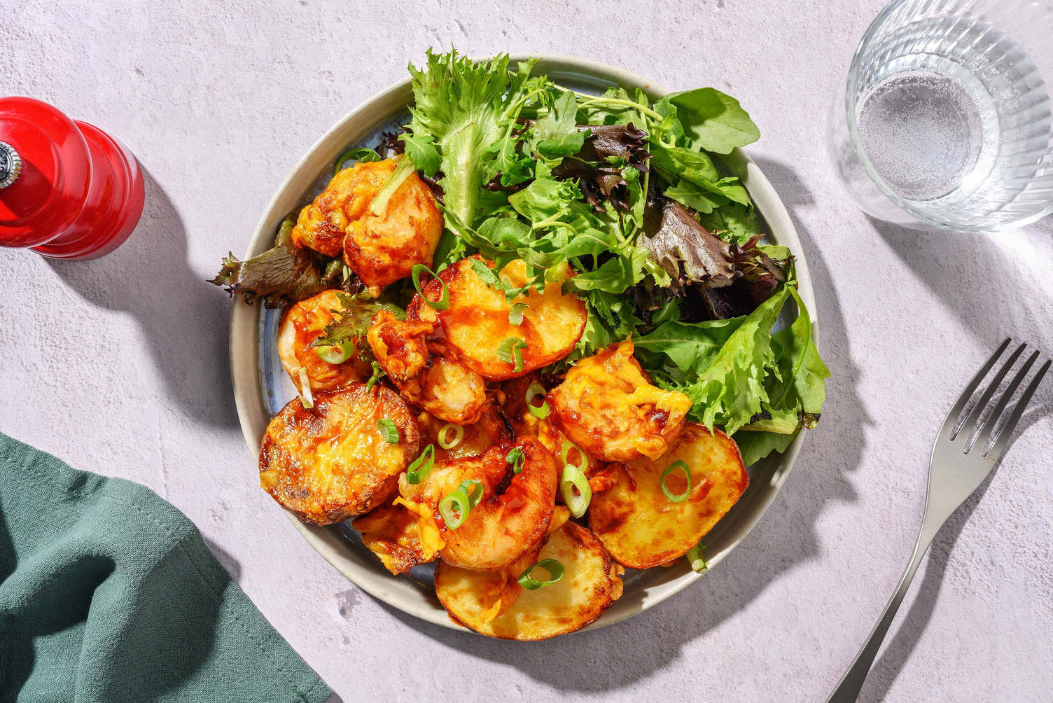 Hähnchen mit BBQ-Soße, restlicher Sojasoße und 2 EL [3 EL | 4 EL] Wasser* ablöschen und 1 Min. einköcheln lassen, bis das Hähnchen glasiert ist. Ggf. warmhalten.