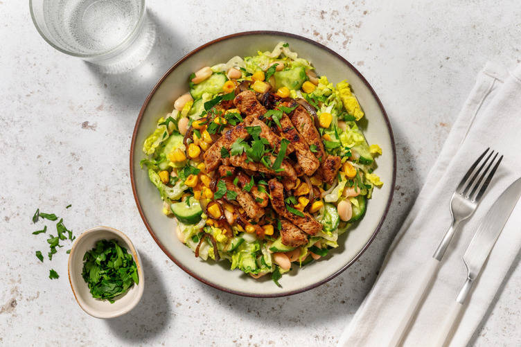 In einer großen Schüssel Balsamicocreme, Senf, 3 EL [4,5 EL | 6 EL] Olivenöl*, 2 TL [3 TL | 4 TL] Essig*, Salz* und Pfeffer* zu einem Dressing vermengen.