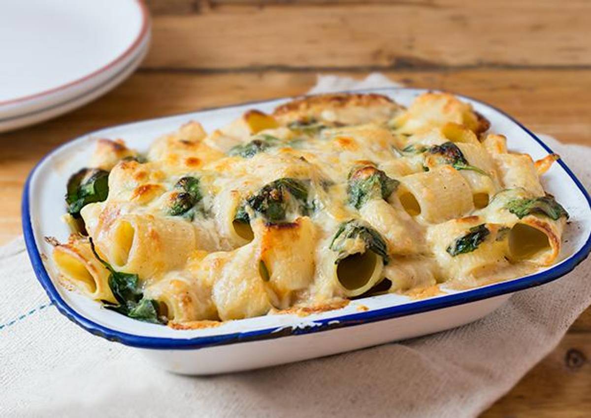 verfeinert mit Spinat und geriebenem Käse