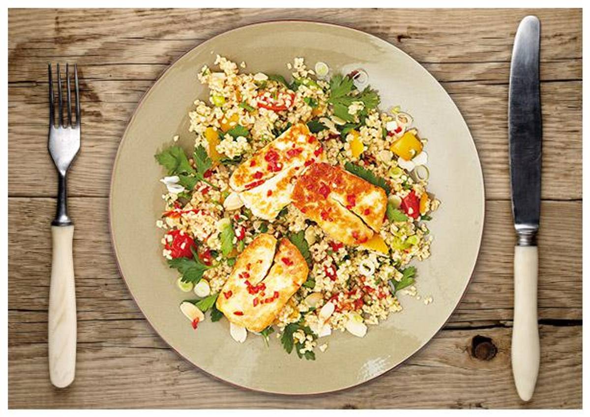 auf buntem Bulgur mit Paprika, Kirschtomaten und Mandelblättchen