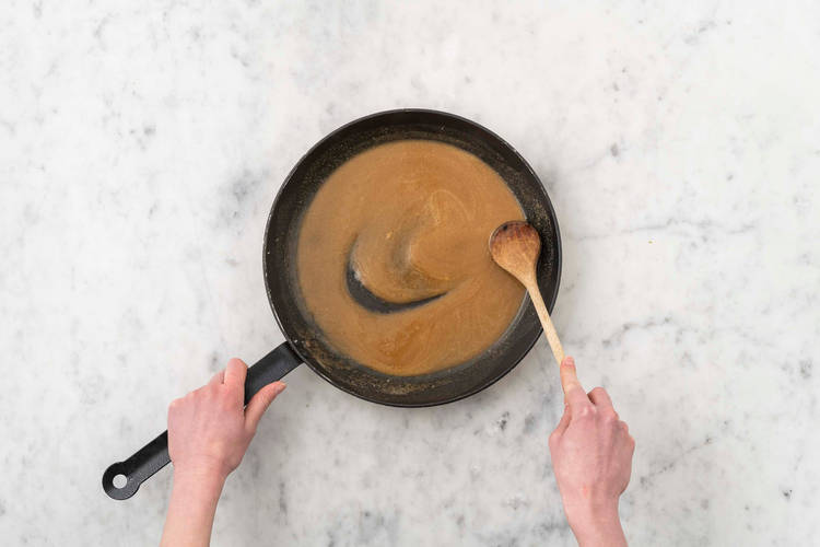 Spargel aus der Pfanne nehmen. Teriyakisoße, Erdnussbutter, Saft aus 1 [1 | 2] Limettenspalte und 100 ml [100 ml | 200 ml] Wasser* hinzufügen, verrühren und einmal aufkochen lassen. Pfanne vom Herd nehmen.