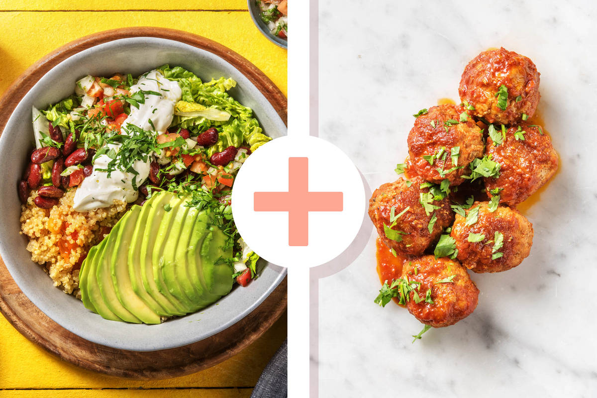 Extra Leckerbissen! Deine Burrito Bowl mit Tomaten-Quinoa und feurigen Kidneybohnen erfährt heute ein Upgrade durch leckere, mexikanische Hackbällchen. Wusstest Du, dass die Bowl dank Quinoa sogar völlig Glutenfrei ist. Was aber natürlich nicht fehlen darf sind die ballaststoffreichen Kidneybohnen und lecker-cremige Avocadostreifen, die für die frische Abwechslung sorgen. Also Löffel verteilen und glücklich essen!