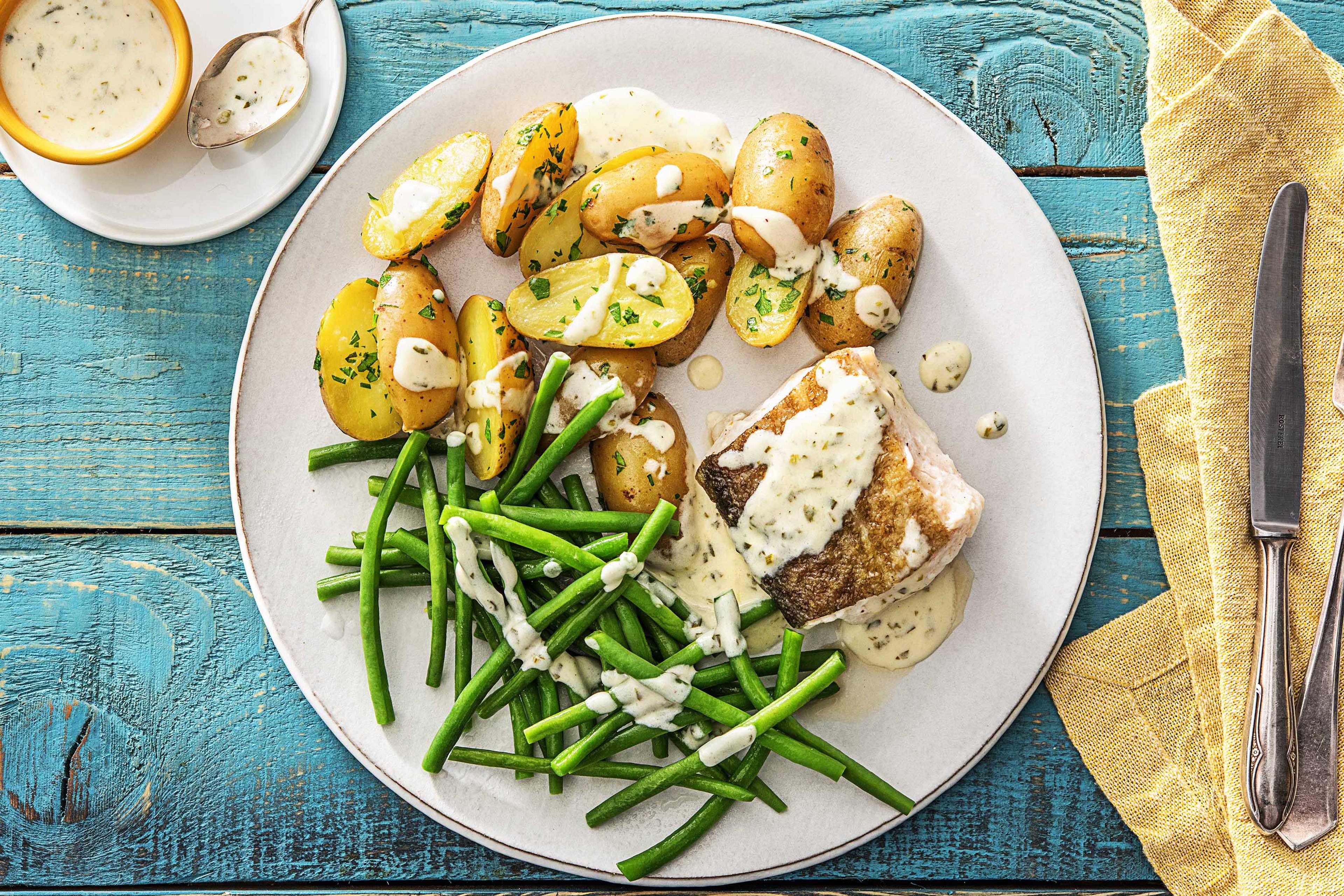 In einem hohen Rührgefäß Crème fraîche, restliche Jalapeño, restliche Kräuter, restliche Frühlingszwiebelringe, 0,5 TL [0,75 TL | 1 TL] Salz*, Pfeffer* und 1 TL [1,5 TL | 2 TL] Essig* mithilfe eines Pürierstabs zu einer glatten Soße verarbeiten.