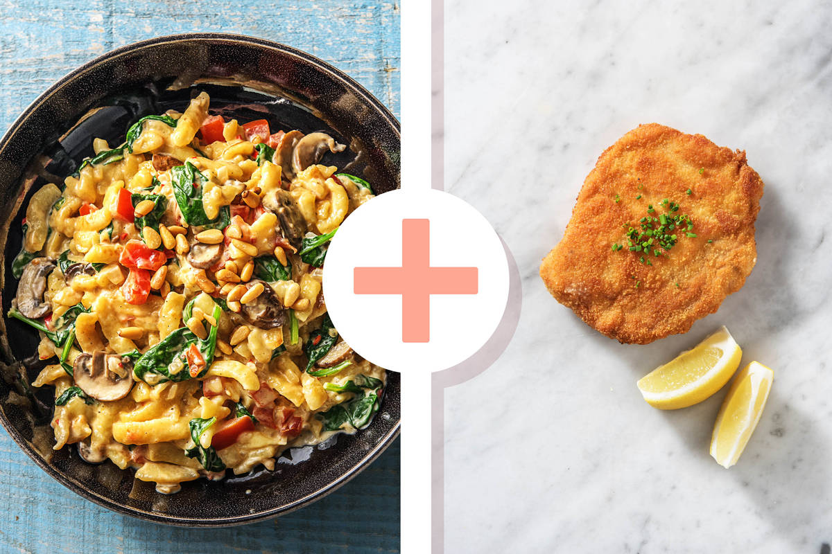 Deine cremige Spätzlepfanne erfährt heute ein Upgrade durch ein leckeres goldbraun angebratenes Schnitzel. Mit unserem ballaststoff- und proteinreichen Rezept holst Du Dir so ein deftiges und trotzdem cremiges Gericht auf Deinen Teller und wirst bald feststellen, dass knusprig und cremig essen wunderbar zusammen passen. Lass es Dir schmecken!