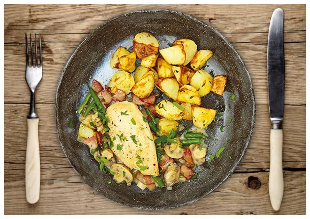 mit Champignons und grünen Bohnen an knusprigen Thymian-Kartoffelecken