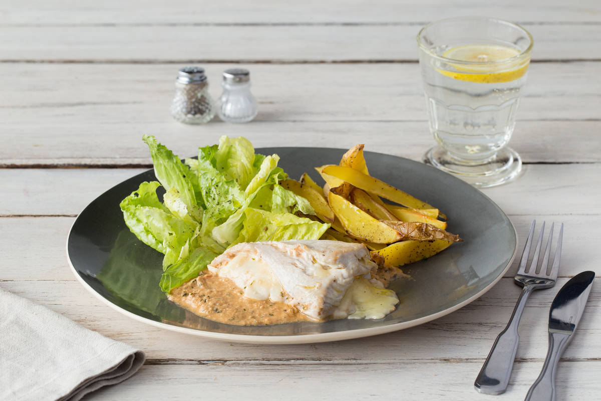 Putenbrust der Länge nach aufschneiden, die Innenseiten mit Salz und Pfeffer würzen. Bergkäse halbieren und die Putenbrust damit füllen. Dann zusammendrücken und in eine leicht gefettete Auflaufform legen. Für 15–20 Min. auf die mittlere Schiene im Ofen zu den Kartoffeln geben.
