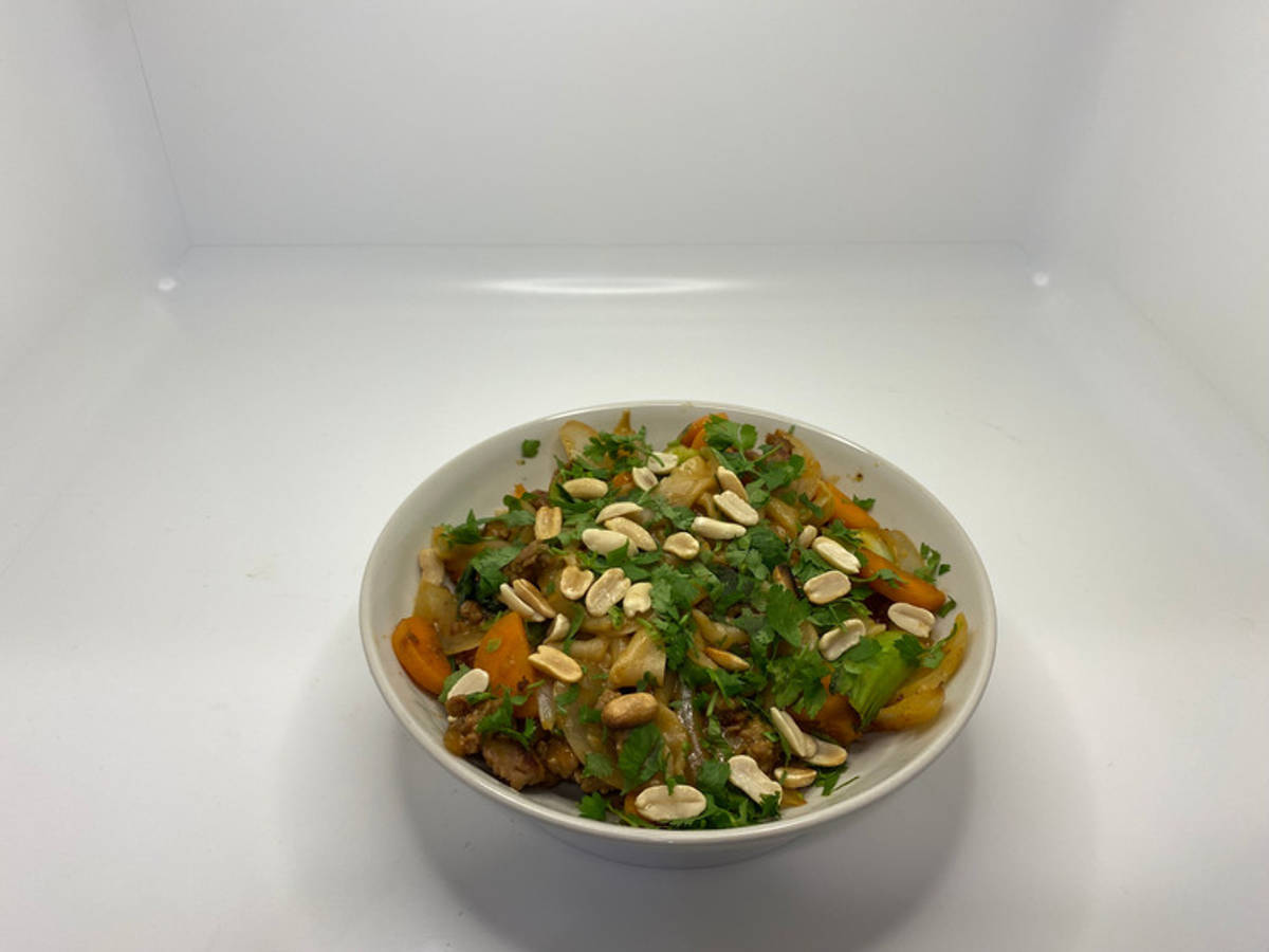 Selbstgemachte Scherennudeln auf Teller verteilen. Mit Erdnüssen und restlichem Koriander garnieren.