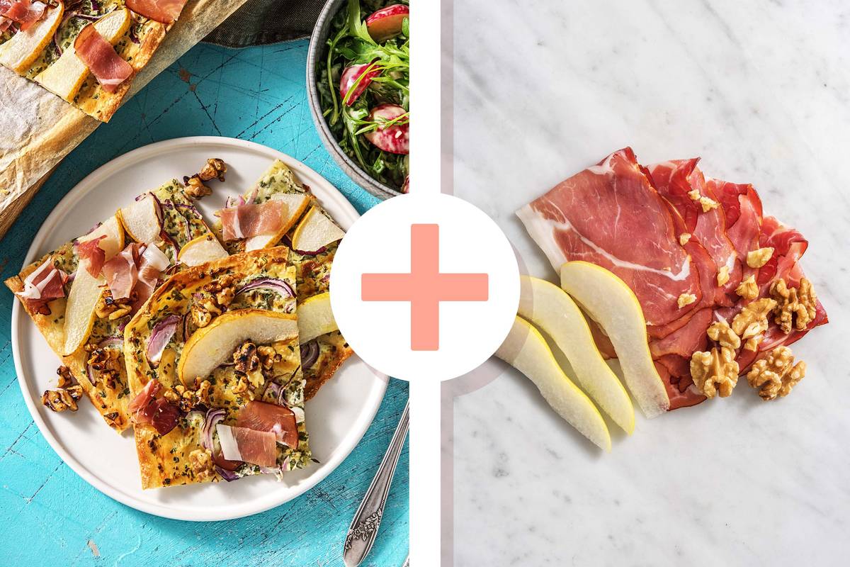 Du hast Lust auf einen Extra Leckerbissen zu Deinem knusprigen Flammkuchen? Dann bist Du hier genau richtig! Saftig-würziger Schwarzwälder Schinken ist der klassische Hingucker, der dieses Gericht zum Gaumenschmaus macht. Der regionale Schinken passt perfekt zu dem selbst gemachten Kräuterfrischkäse, dem herben Rucola und den gerösteten Walnüssen. Dabei ist die Zubereitung kinderleicht. Lass es Dir schmecken!