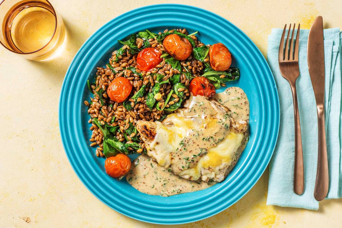 Hähnchenbrust, Tomaten, Dinkel und Soße auf Tellern anrichten und mit Soße genießen.