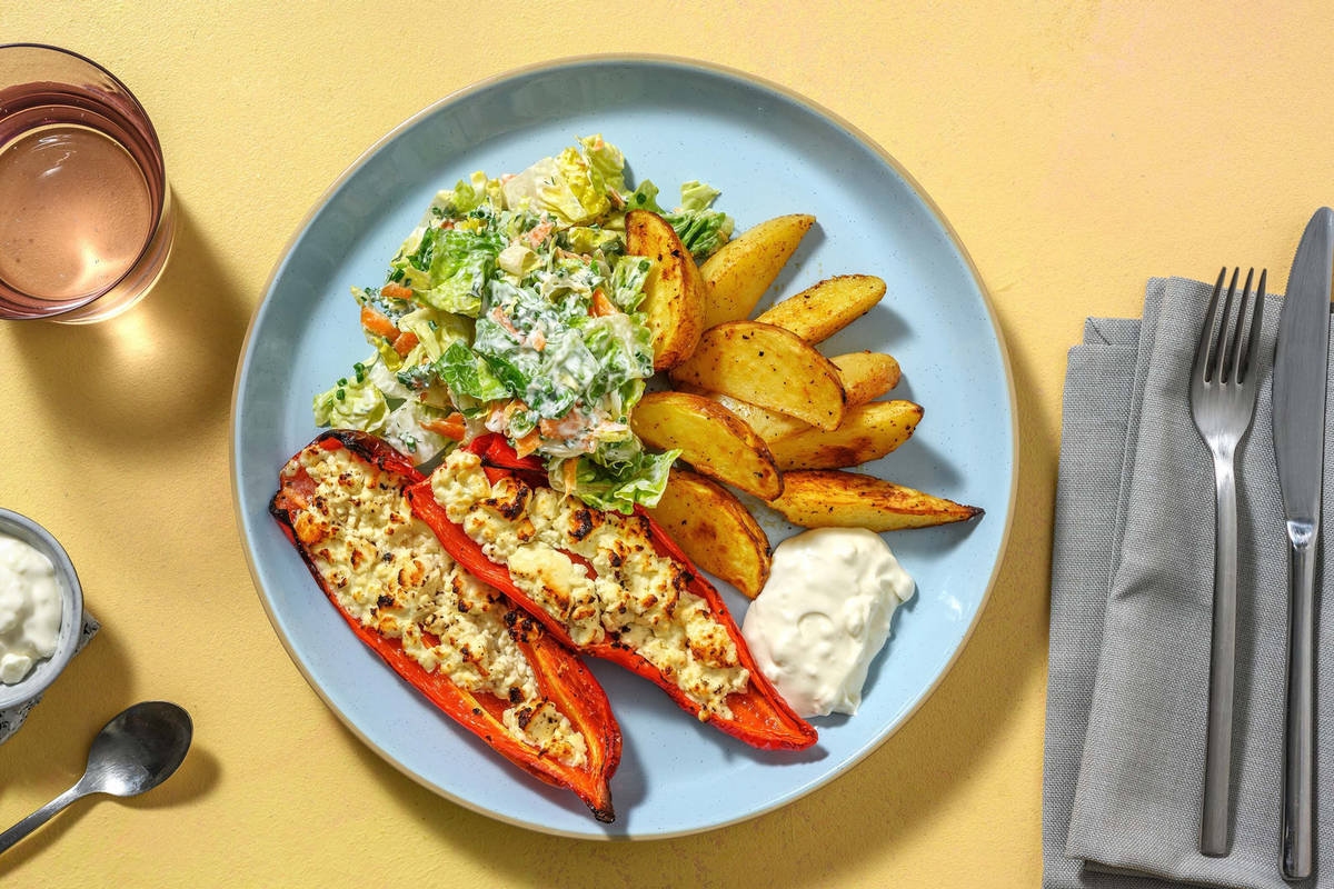 Heize den Backofen auf 220 °C Ober-/Unterhitze (200 °C Umluft) vor. Spitzpaprika längs halbieren, Kerngehäuse entfernen und Spitzpaprikas mit dem Hirtenkäse füllen. Mit Salz* und Pfeffer* würzen.