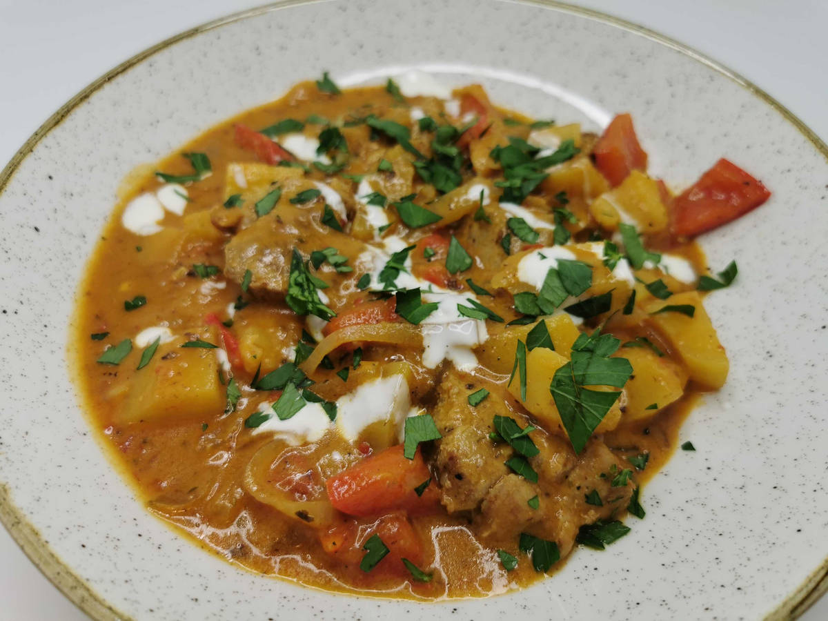 Brühepulver, Ajvar, „Hello Paprika“ und 0,5 TL [0,75 TL | 1 TL] Salz* hineinrühren und alles 10 – 12 Min. köcheln lassen, bis die Kartoffeln gar sind.