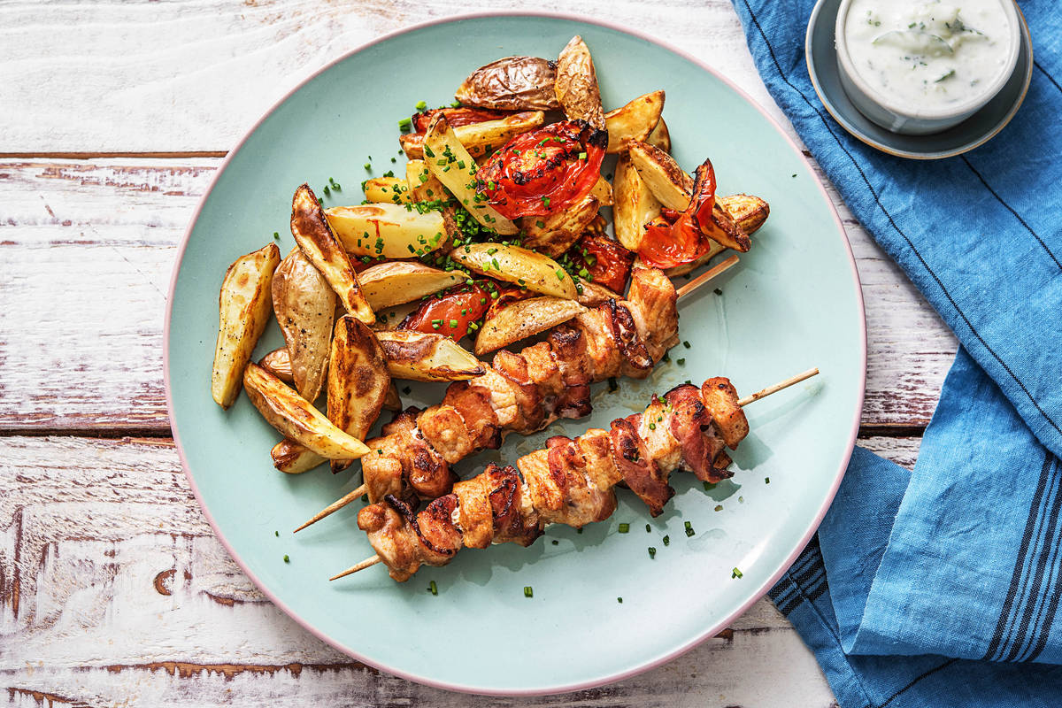 Wenn wir an griechisches Essen denken, kommt uns sofort Tsatsiki in den Sinn. Und der ist so lecker, dass keine Grillparty ohne ihn stattfinden kann! Damit auch Du in den Genuss kommst, verraten wir Dir heute unser Lieblingsrezept für Tsatsiki. Dazu gibt es noch saftige, **proteinreiche** Gyrosspieße mit Bacon und Kartoffel- und Tomatenspalten aus dem Backofen, die Dir genügend **Ballaststoffe** liefern. Guten Appetit wünschen wir Dir!