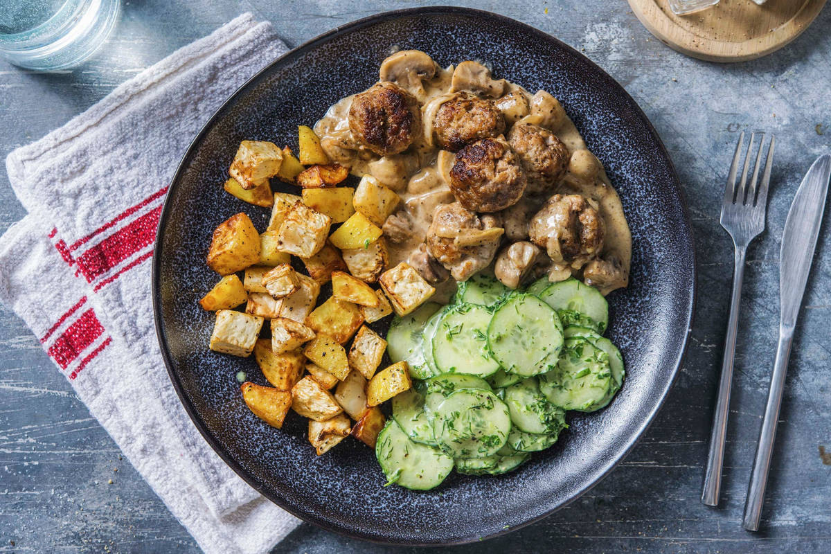 Ofengemüse auf Teller verteilen. Fleischbällchen mit Champignon-Rahmsoße und Gurkensalat daneben anrichten.