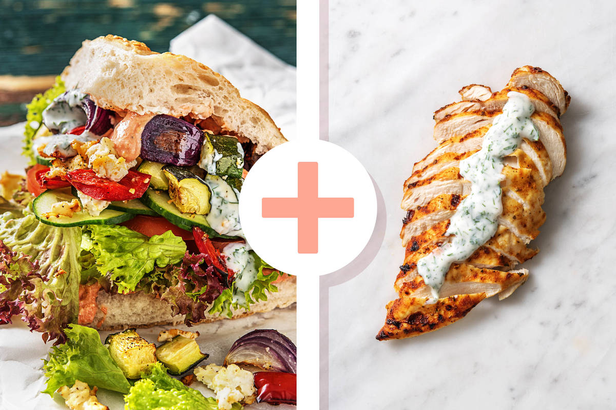 Extra Leckerbissen! Dein Döner mit Ofengemüse erfährt heute ein Upgrade durch lecker marinierte, dünn aufgeschnittene Hähnchenbrust. So verwöhnst Du Dich und erlebst ein richtiges Fest der Sinne, sobald Du herzhaft hineinbeißt! Unsere Dönervariante holt Dir außerdem schon einmal den Sommer auf den Tisch und verwöhnt Dich durch einen würzigen Hirtenkäse-Tomaten-Dip und einen leichten Knoblauchjoghurt. Lass es Dir schmecken!