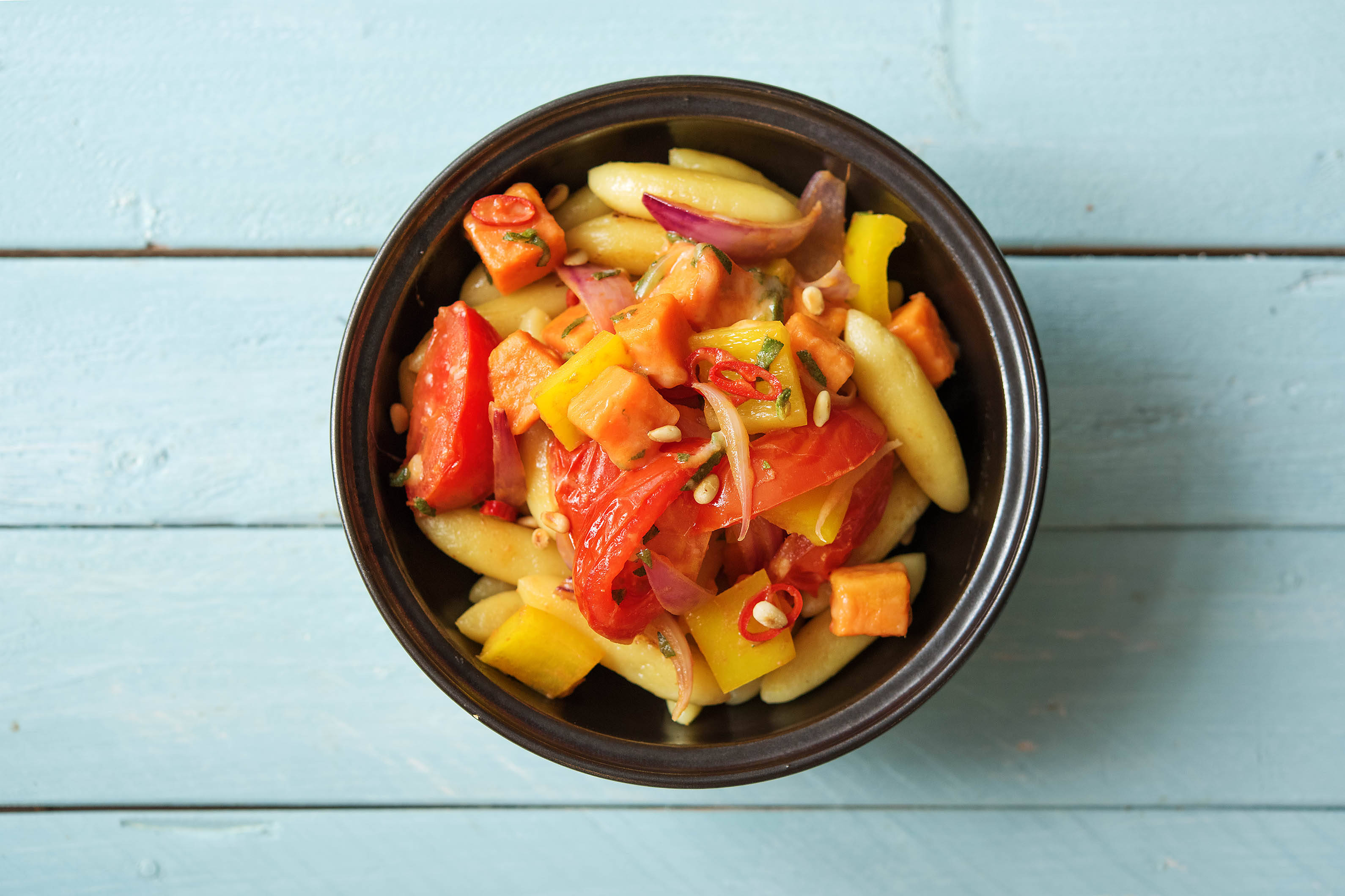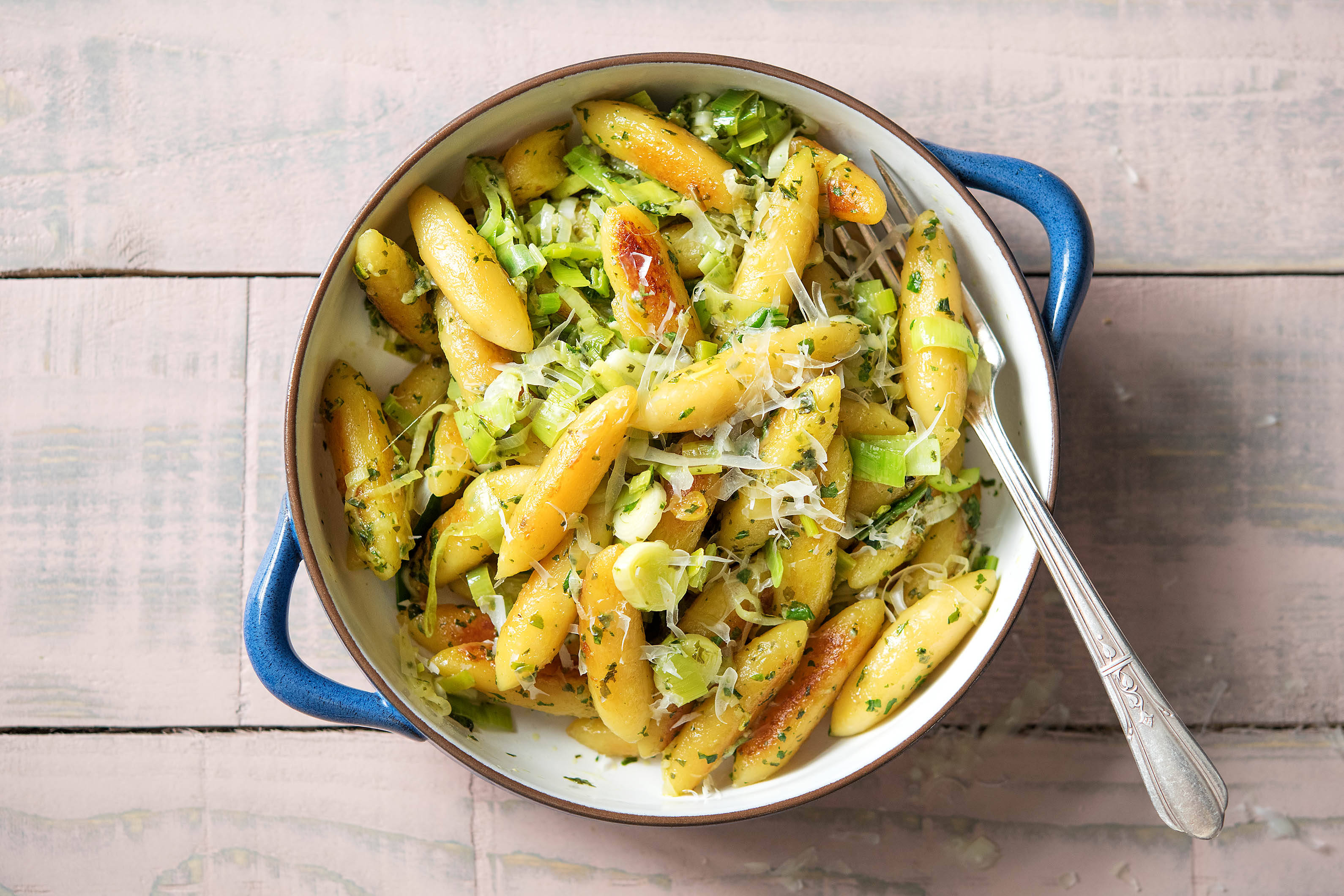 Hähnchen-Schupfnudelpfanne mit Kräuter-Käse Topping