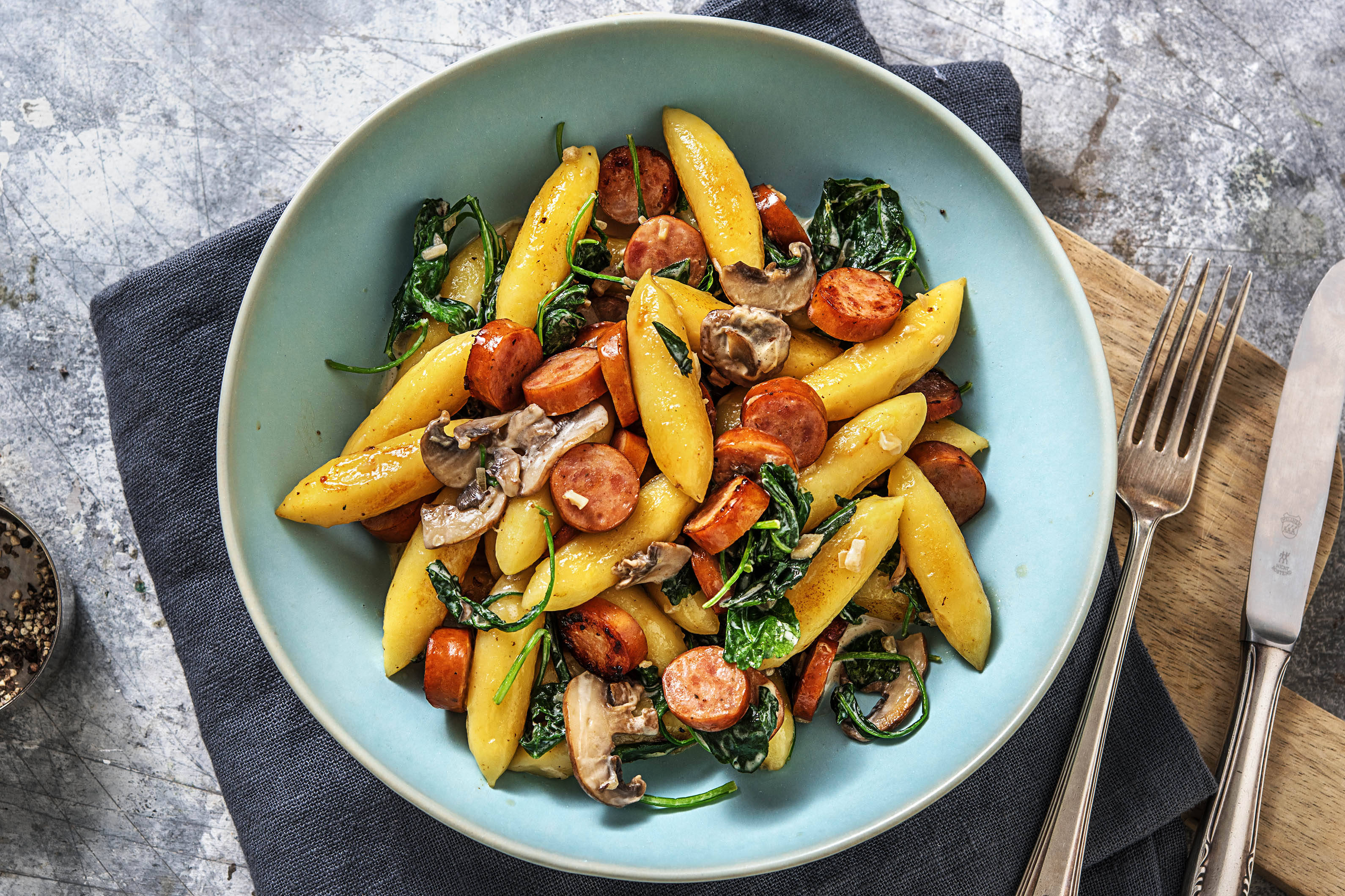 Schupfnudeln und Worcester Sauce unter die Soße heben. Mit Salz* und Pfeffer* abschmecken.