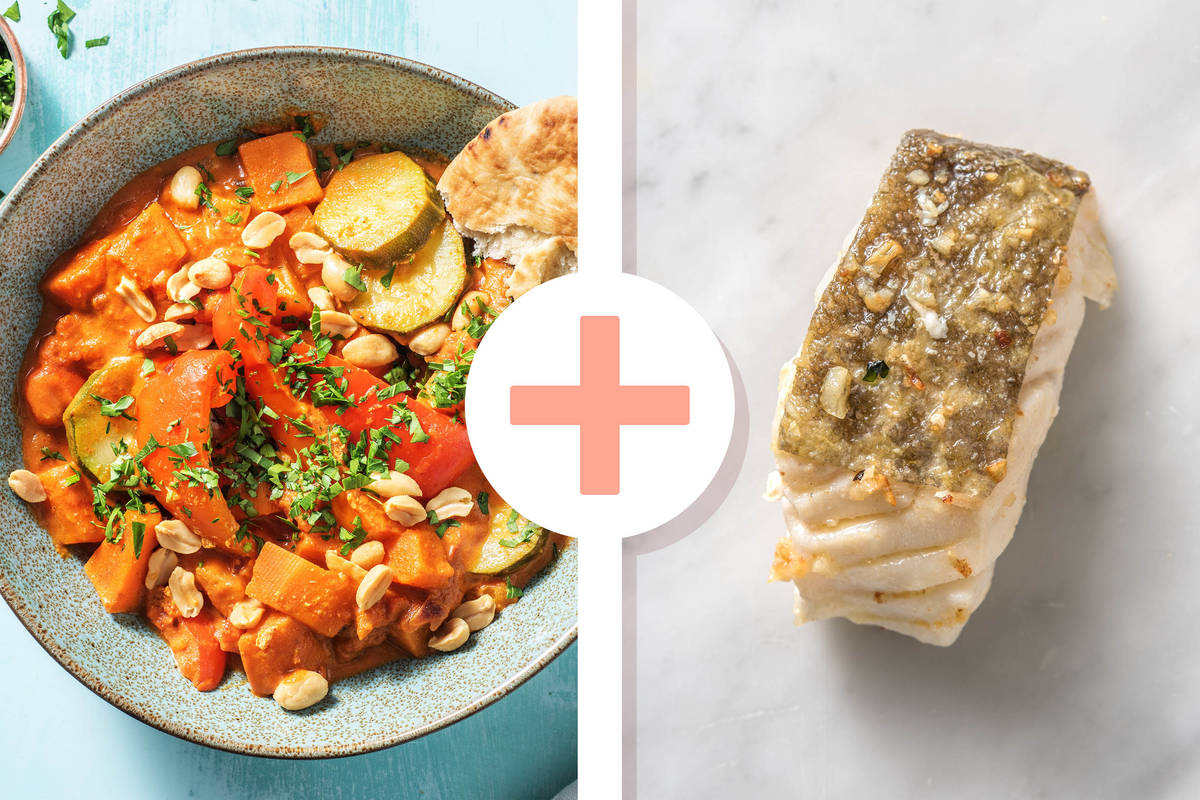Varoma-Gemüse und Süßkartoffelwürfel in eine große Schüssel geben. Tandoori Tikka-Currysoße darüber geben und alles gut vermengen. Tikka Masala-Curry in Schüsseln verteilen und Schellfischfilet darauf anrichten. Mit grünen Frühlingszwiebelringen und Erdnüssen bestreuen und zusammen mit Naan-Brot genießen.