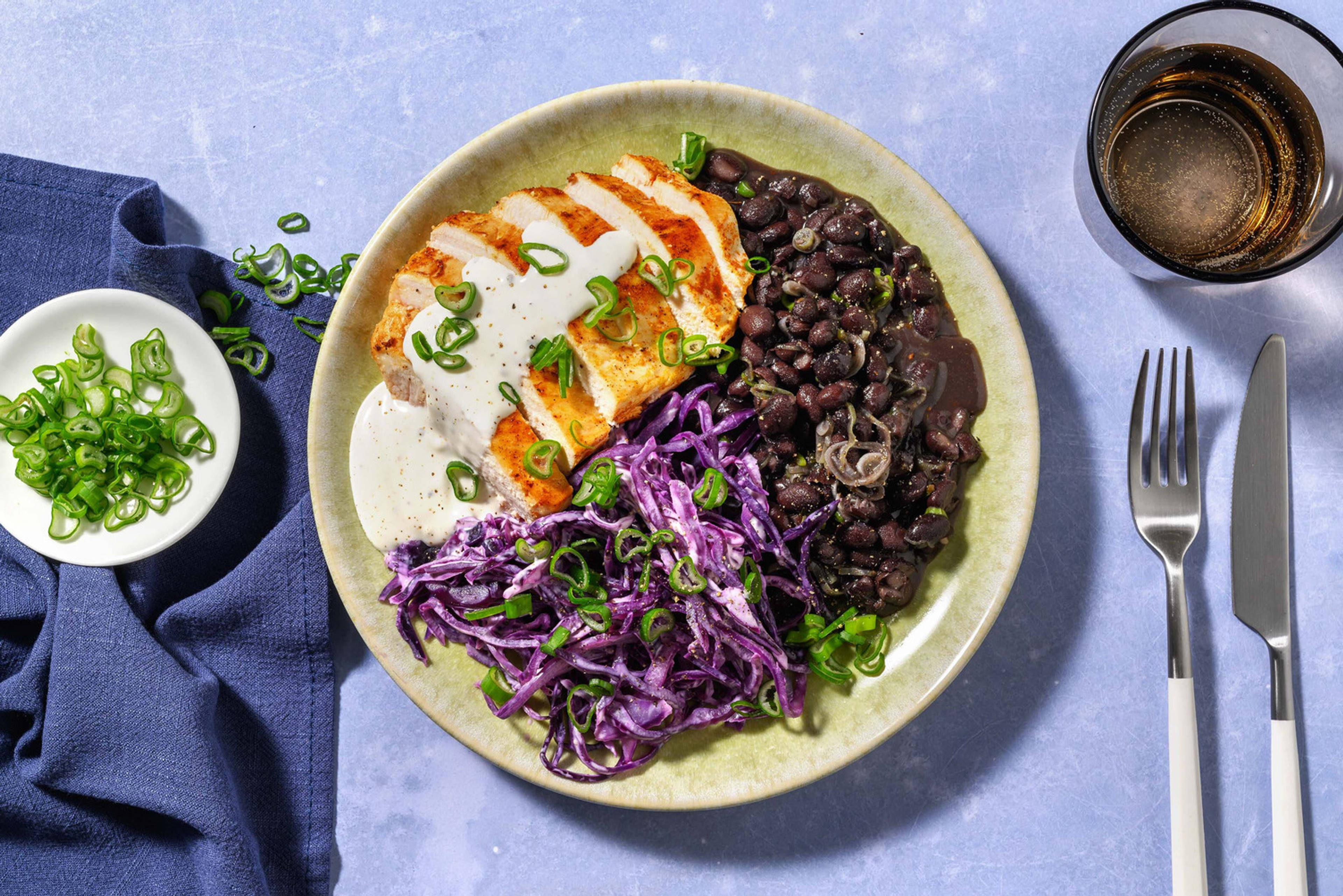 Chili halbieren, entkernen und in ca. 2 cm große Stücke schneiden, in den Mixtopf geben, 3 Sek./Stufe 8 zerkleinern und in eine kleine Schüssel umfüllen. Frühlingszwiebeln getrennt voneinander in feine Ringe schneiden. Kirschtomaten halbieren. Blätter vom Thymian abstreifen. Basilikum und Petersilie mit Stielen in ca. 2 cm große Stücke schneiden.