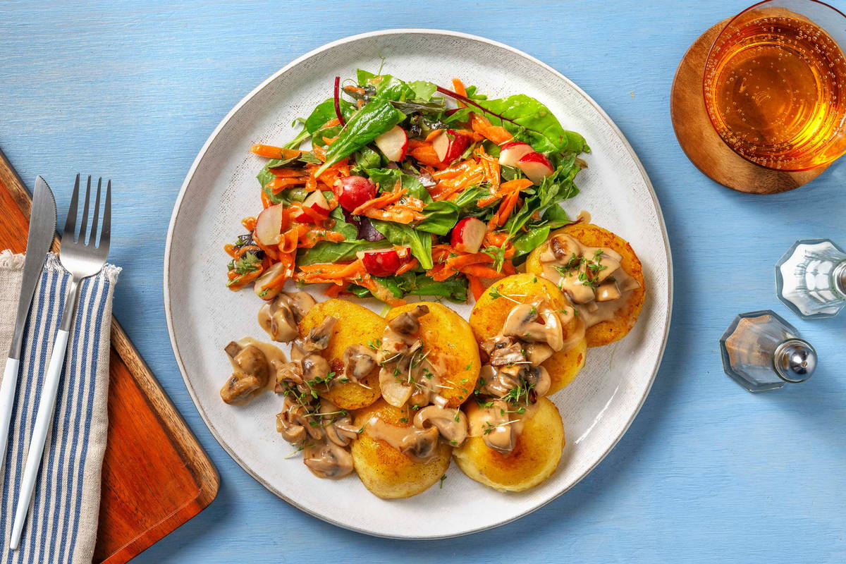 Pflücksalat unter den vorbereiteten Salat heben. Salat auf Teller verteilen, Knödeltaler daneben anrichten. Champignonrahm nach Belieben auf den Knödeltalern verteilen oder dazureichen. Restliche Kresse abschneiden und Knödeltaler damit garnieren. Guten Appetit!