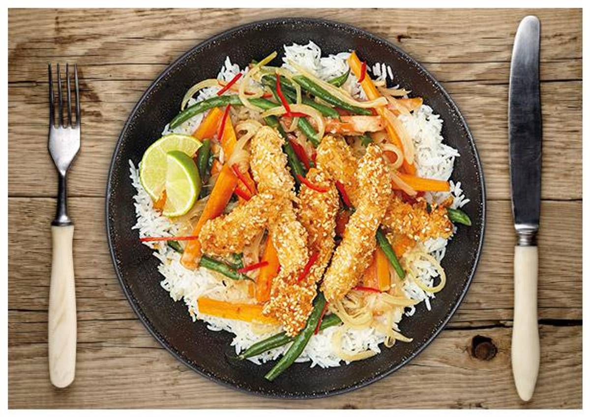 auf würzigem Reis dazu scharfer Ketchup-Dip