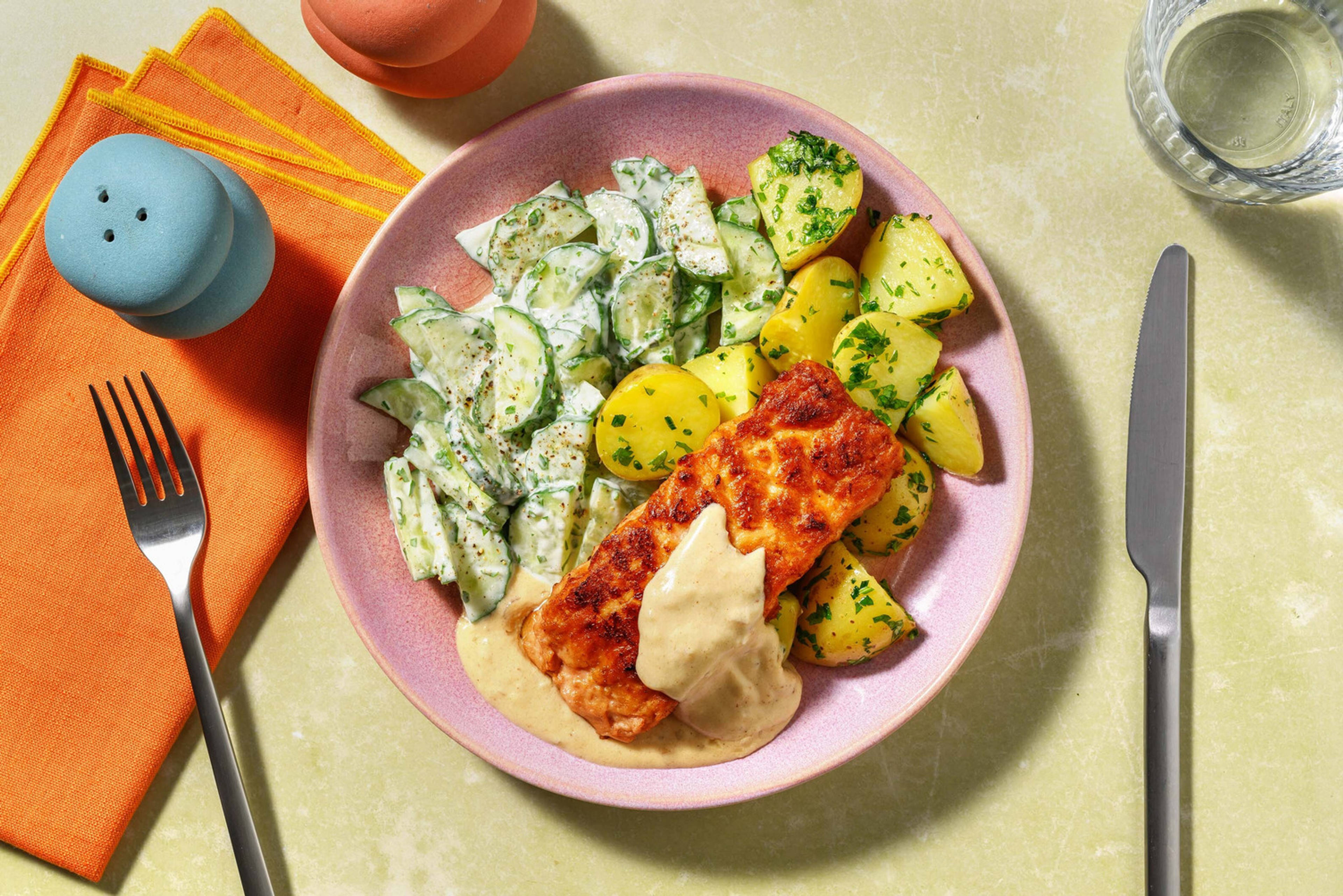 Gurkenscheiben in ein Sieb geben und kurz abtropfen lassen. Zurück in die Schüssel geben und mit Kresse, Senf, Essig, 1 EL Olivenöl und dem Großteil der Kräuter vermengen. Kartoffelscheiben und Brokkolini in das Sieb abgießen, kurz abtropfen lassen und vorsichtig mit den Gurken vermischen.