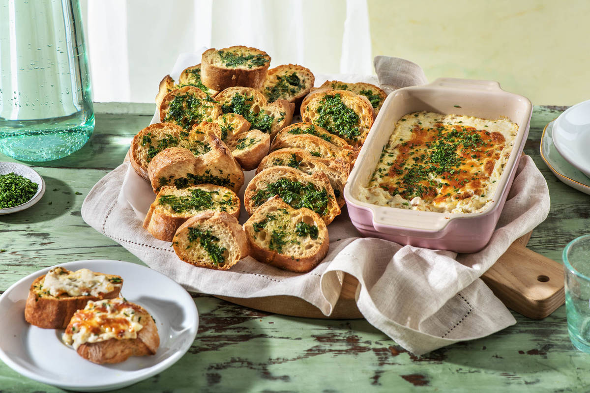 Dip aus dem Ofen nehmen, mit Schnittlauchröllchen toppen und noch warm mit Knoblauchbrot genießen. Guten Appetit!