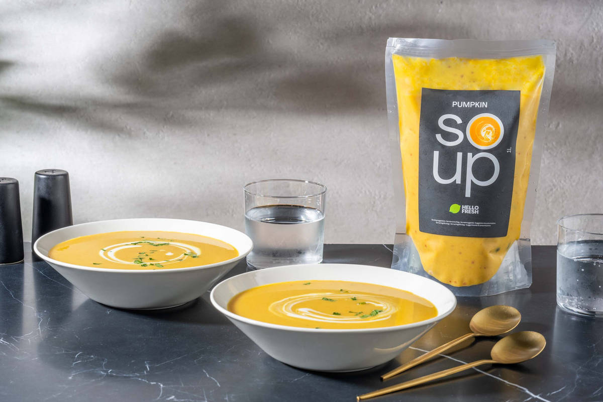 Kürbissuppe Zutaten: Kürbis (41 %), Wasser, Sahne, Karotte, Zwiebel, Kürbiskerne, Knollensellerie, Meersalz, gemischte Kräuter und Gewürze, Kartoffelstärke, Ingwer. Lagerung: Gekühlt bei max. 4 °C. Bei offener Verpackung verkürzt sich die Haltbarkeit. Nach dem Öffnen schnellstmöglich verbrauchen. Inverkehrbringer: HelloFresh Deutschland SE & Co. KG | Prinzenstr. 89 | 10969 Berlin | Deutschland | www.hellofresh.de Kann Spuren von Ei, glutenhaltigem Getreide, Lupine, Schalenfrüchten, Erdnüssen, Soja, Sulfit und Fisch enthalten.