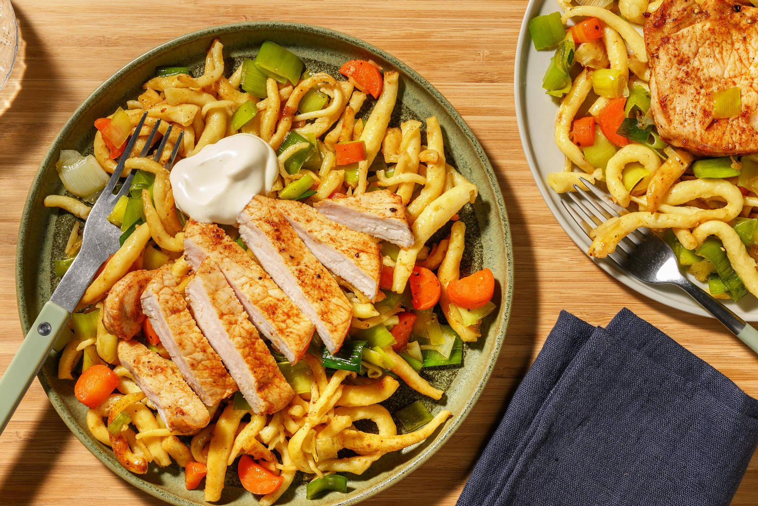 In einer zweiten großen Pfanne 1 EL [11/2 EL | 2 EL] Öl* erhitzen und Schweinelachssteaks bei hoher Hitze je Seite ca. 3 Min. knusprig braten, bis das Fleisch leicht rosa ist. Mit Salz* und Pfeffer* würzen.