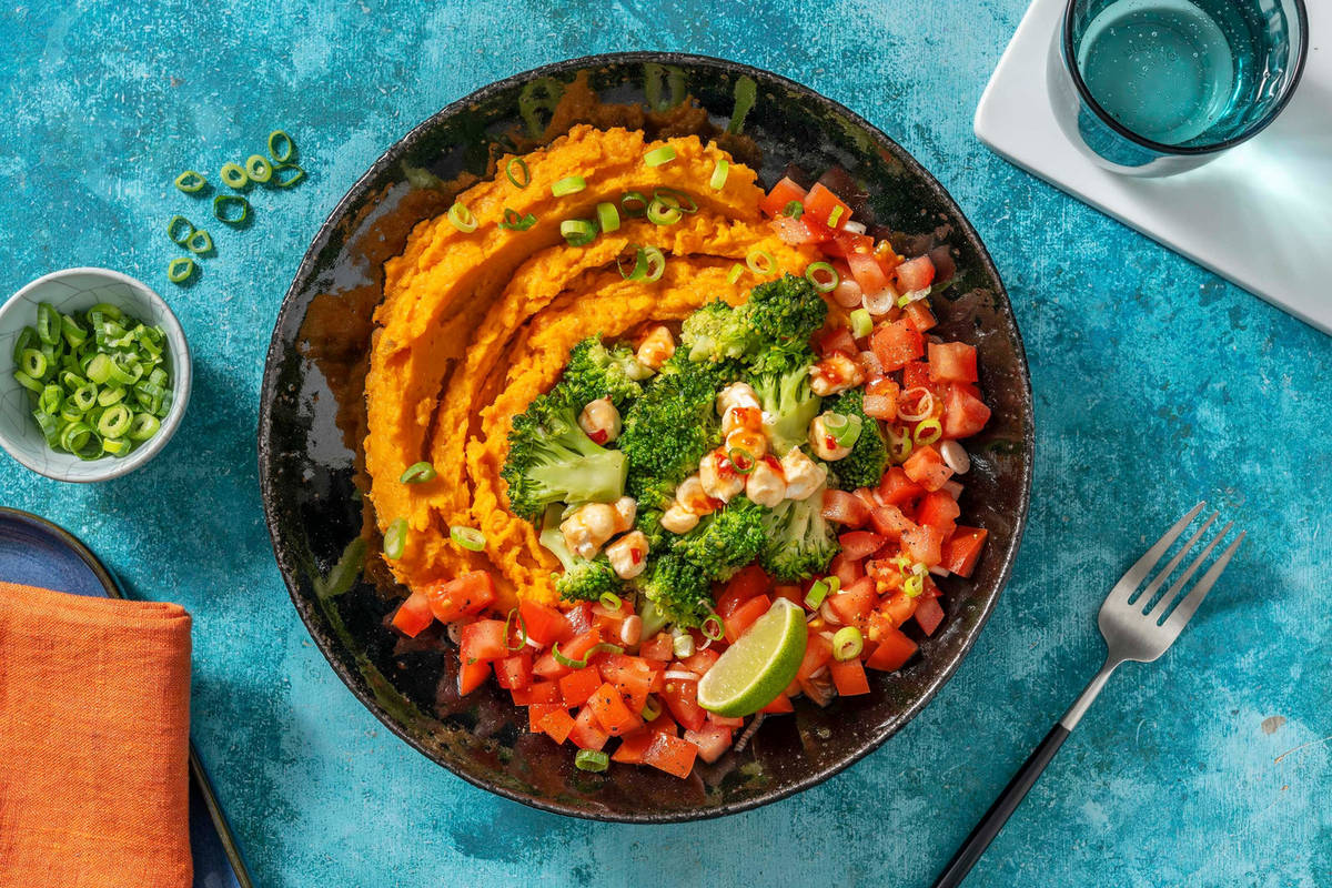 Süßkartoffelstampf in der Mitte auf tiefen Tellern verteilen. Mit Brokkoli und Sweet-Chili Ziegenkäse toppen. Tomaten-Salsa daneben anrichten und mit grünem Teil der Frühlingszwiebel garnieren. Guten Appetit!