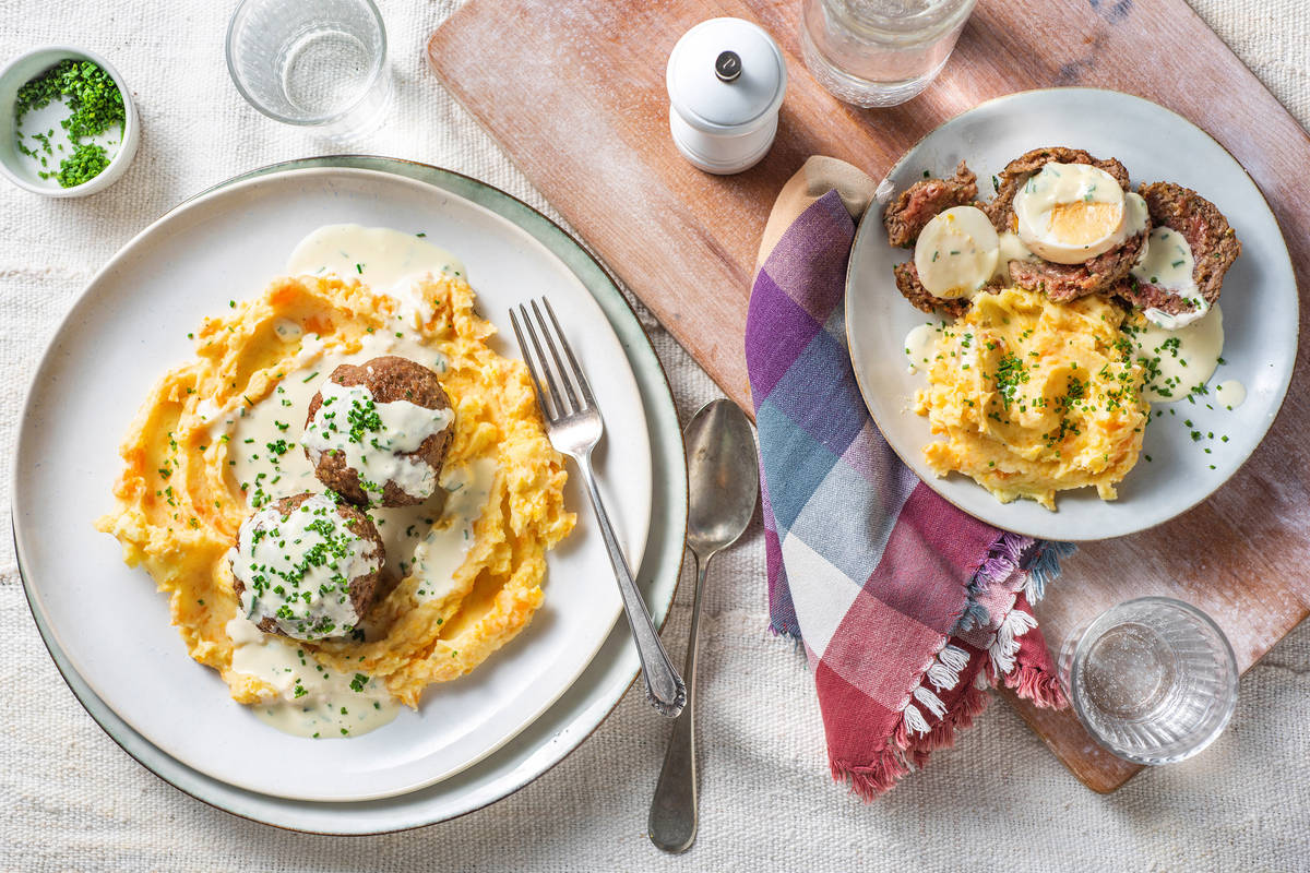 In unseren Hackbällchen hat sich eine besondere Überraschung versteckt: leckere, hartgekochte Eier! Und bei euch am Tisch? Spielt doch eine Runde „Was habe ich verschwinden lassen“. Einer von Euch darf dazu einen Gegenstand verstecken, die anderen müssen raten, was fehlt. Aber vergesst dabei nicht zu essen, solange die Hackbällchen, der Kartoffel-Karotten-Stampf und die cremige Soße noch heiß sind!