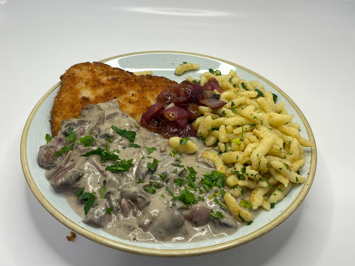Schnitzel auf Teller verteilen. Pilz-Speck-Soße und Spätzle daneben anrichten und mit restlichen Kräutern toppen. Zwiebelchutney auf den Schnitzel verteilen und mit restlichen Zitronenspalten servieren.