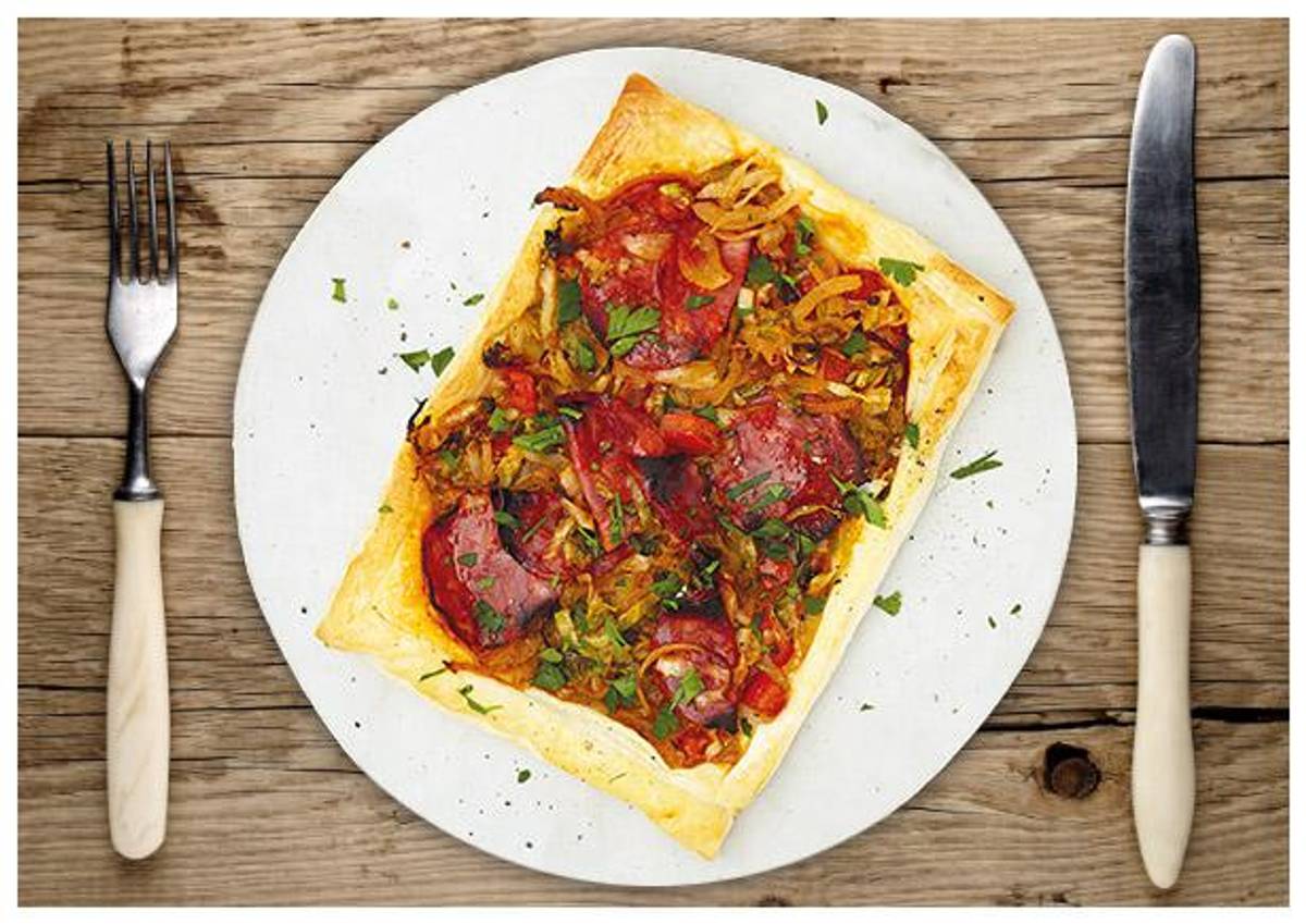 Pikante Chorizo-Spitzkohl-Blätterteigpizza