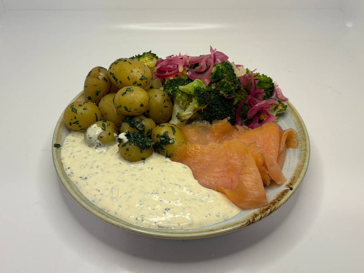 Kräuter-Drillinge, Räucherlachs und Mandel-Brokkoli auf Tellern anrichten, mit eingelegten Zwiebeln toppen und dem Estragon-Senf-Dip genießen.