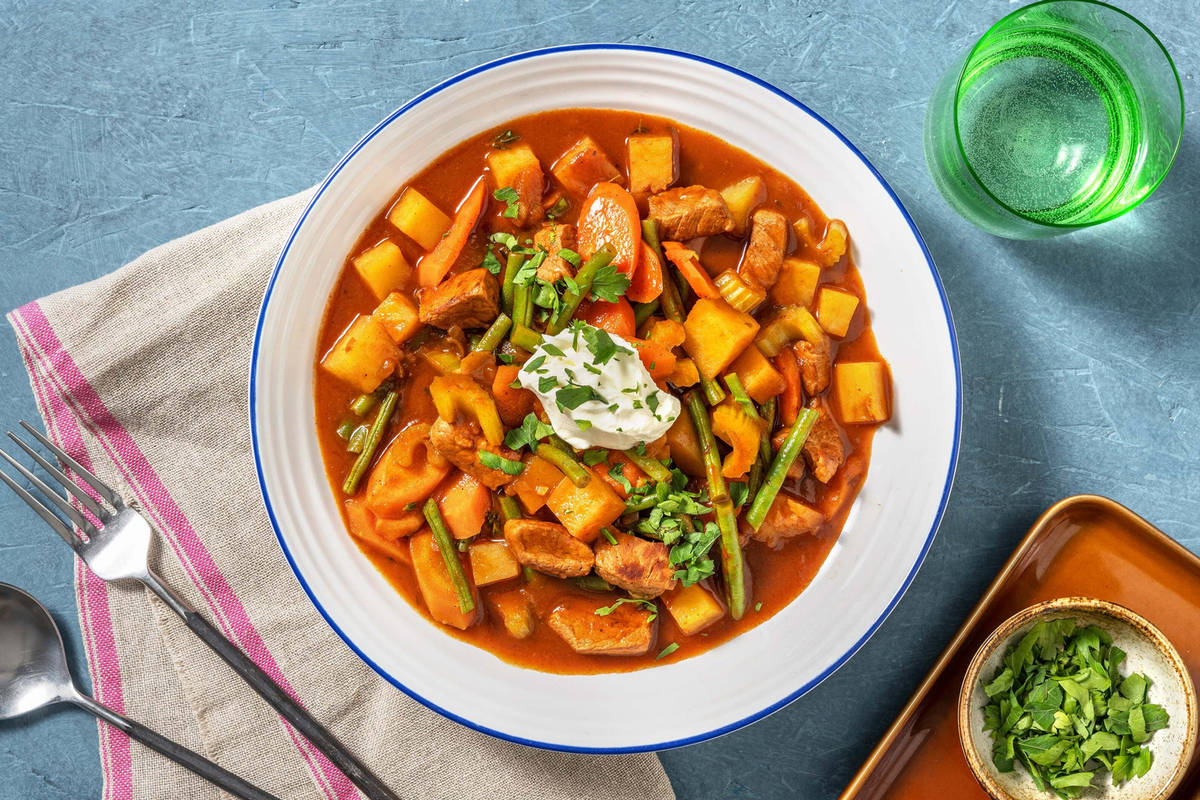 Eintopf mit Salz und Pfeffer abschmecken und auf Teller verteilen. Einen Klecks Schmand auf jeden Teller geben und mit Petersilie bestreuen. Guten Appetit!