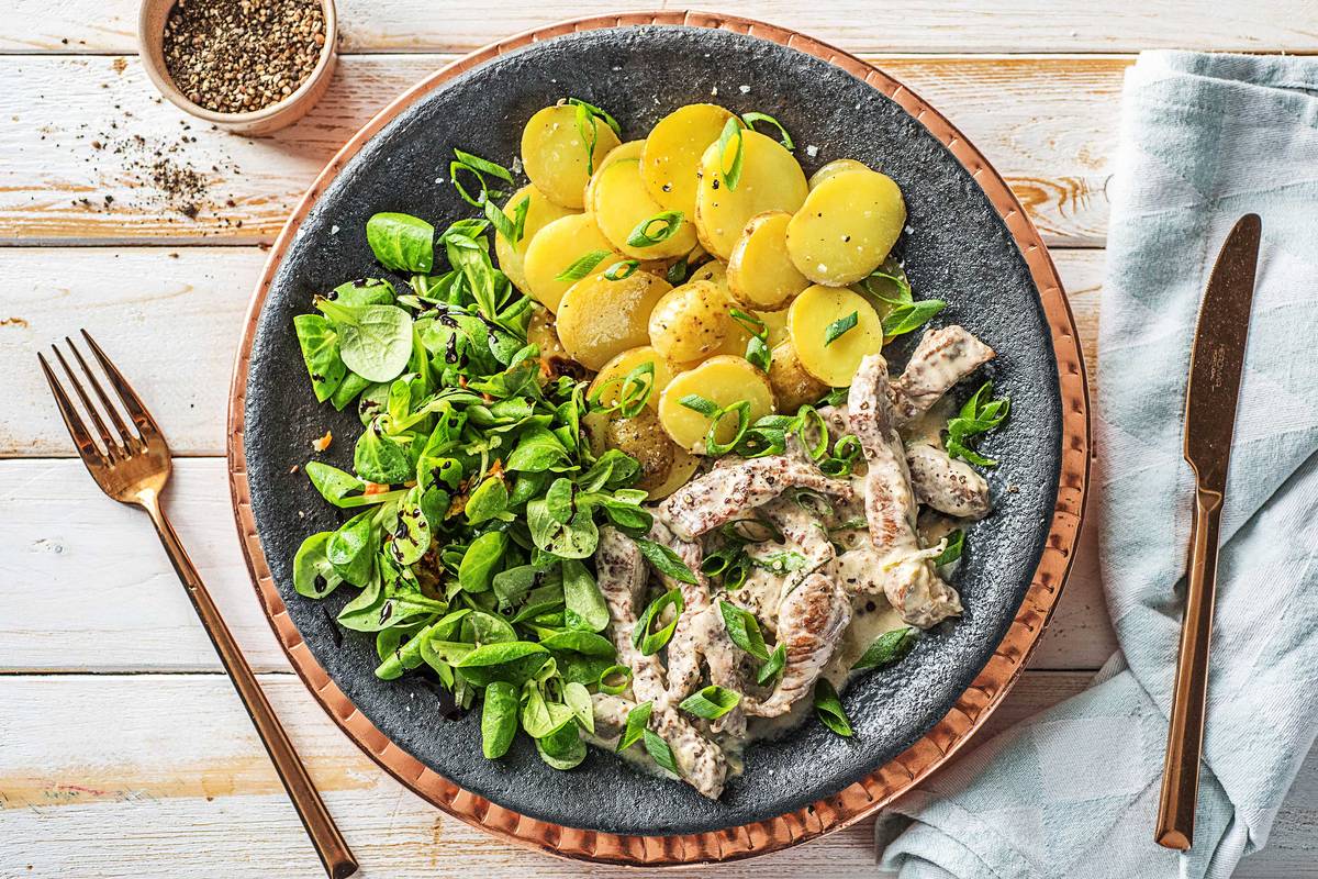 Varoma abnehmen. Kartoffelscheiben auf Teller verteilen, Rindergeschnetzeltes mit Rosmarinsoße dazu anrichten und grüne Frühlingszwiebelringe darüberstreuen. Feldsalat mit Balsamico-Crème beträufeln und alles zusammen genießen.