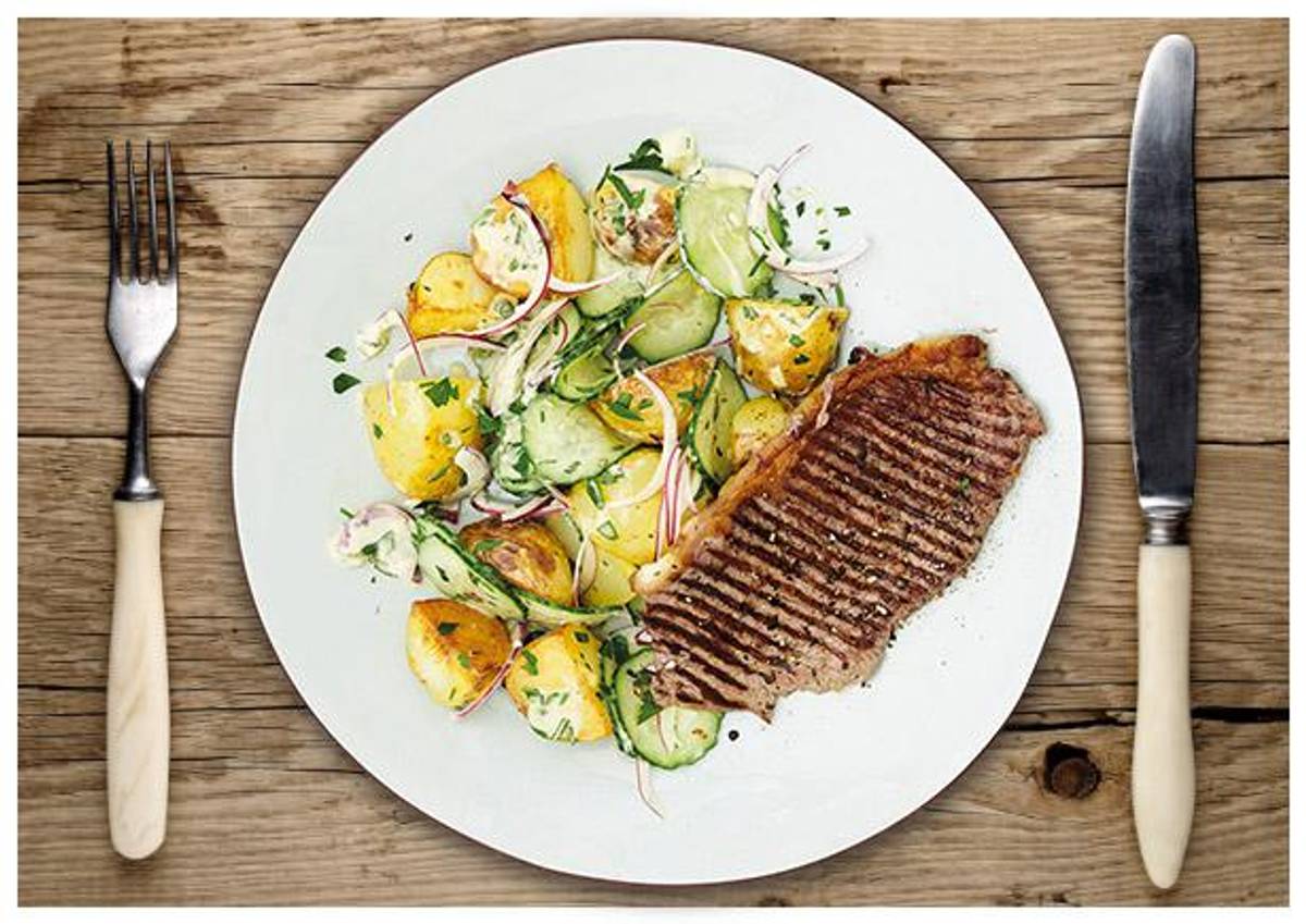 serviert mit cremigem Kartoffel-Gurkensalat, verfeinert mit Oregano und Petersilie