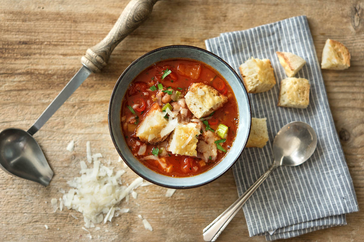 Mmh... knusprige Käse-Croutons, Bacon, Tomaten und wärmende Chili sorgen in dieser Woche für einen leckeren, rustikalen Eintopf. Wenn Du Deinen Eintopf cremiger magst, kannst du ihn auch pürieren. Lass Dir unser leckeres Thermomix-Rezept schmecken!