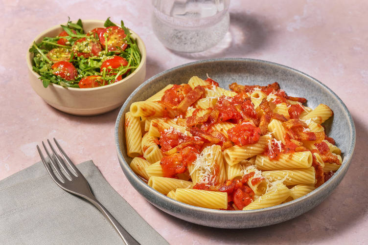 Kochsahne, 50 ml [75 ml | 100 ml] Wasser* und Tomatenpesto zum Guanciale geben, umrühren und einmal aufkochen lassen.