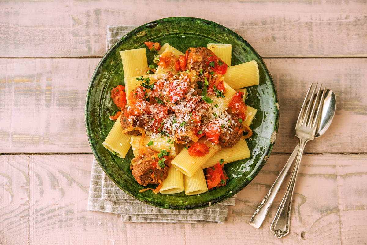Tortiglioni auf Teller verteilen, Bohnen-Bällchen mit Tomatensoße dazu anrichten, mit restlichem Basilikum und geriebenem Hartkäse bestreuen und genießen.