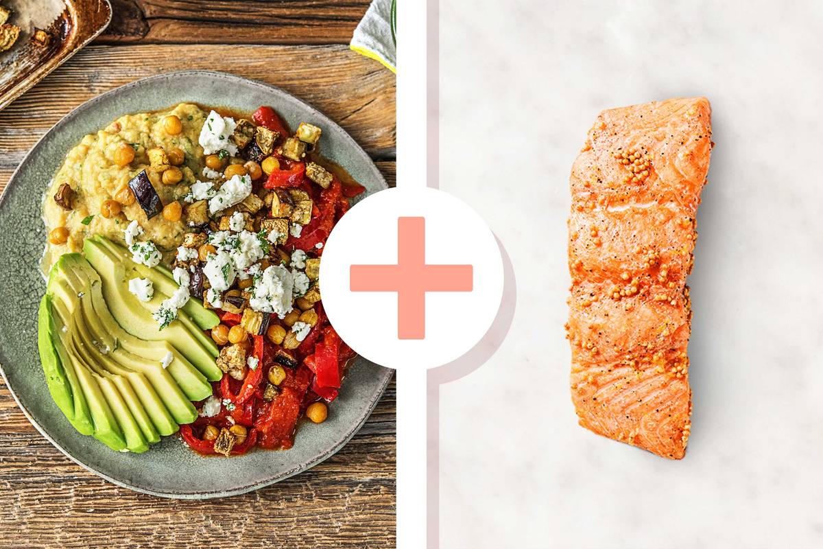 Je einen Klecks Kichererbsencrème auf Teller geben, Paprika-Tomaten-Soße daneben anrichten, Hirtenkäse, gebackene Auberginenwürfel und Kichererbsen darauf verteilen, Lachsfilet und Avocadostreifen dazulegen und mit Tortilla-Wraps genießen.
