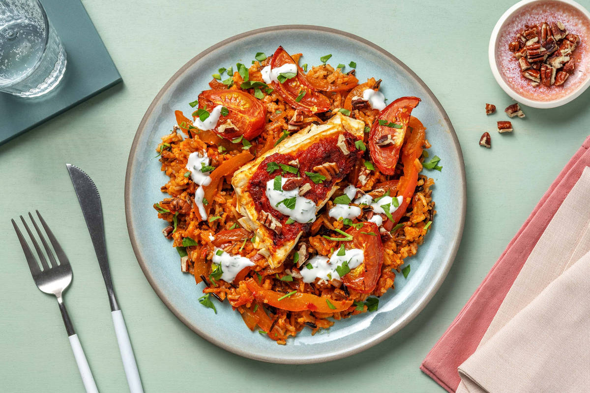 Wildreispfanne mit Salz* und Pfeffer* abschmecken und auf Tellern verteilen. Feta, geschmolzene Tomaten und das Dressing darüber verteilen. Mit gehackter Petersilie und Pekannüssen garnieren und genießen. Guten Appetit!