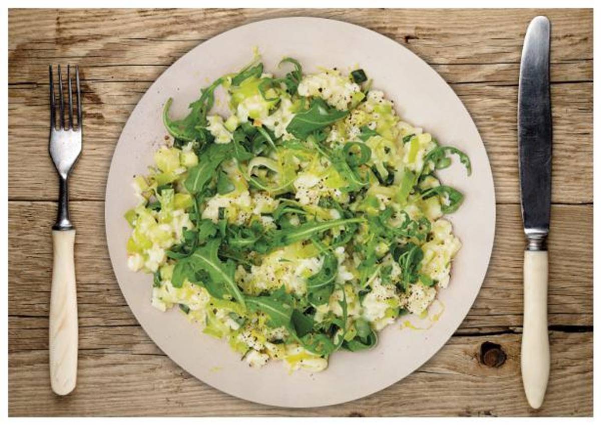 mit Porree und Zucchini, verfeinert mit Creme fraiche und Rucola