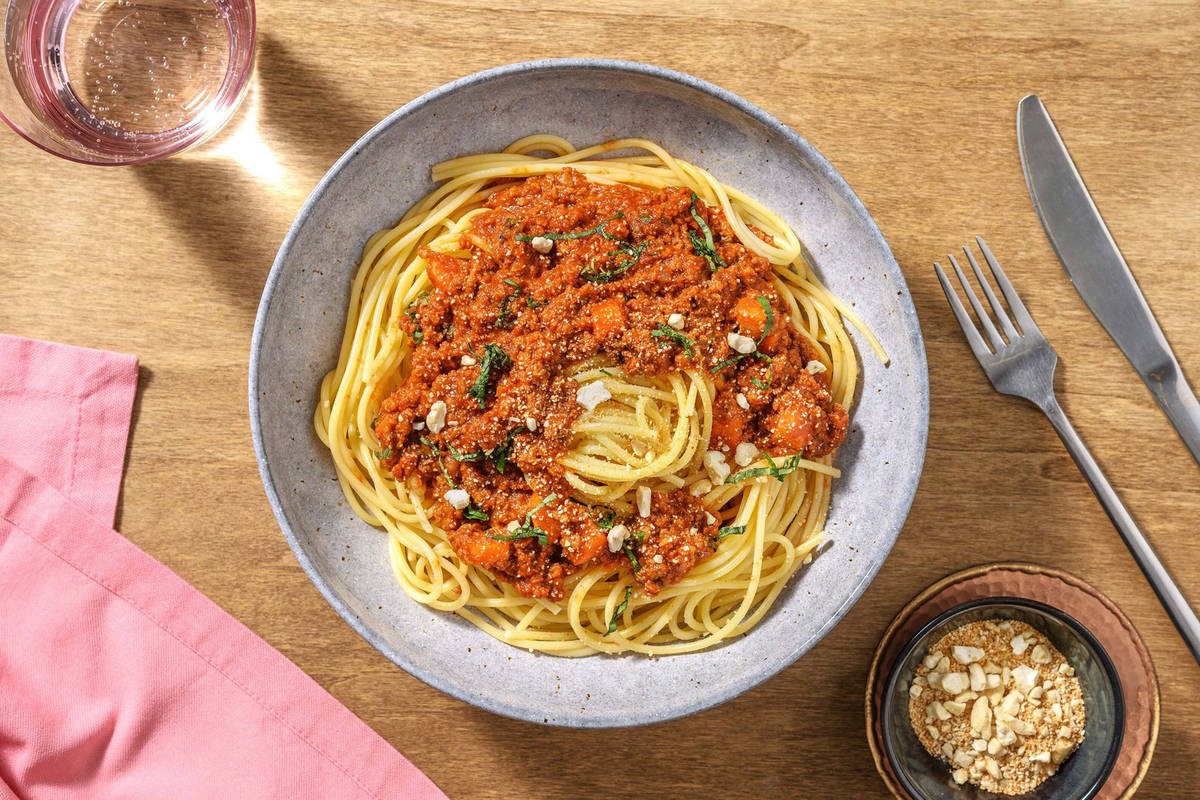 Spaghetti auf Teller verteilen. Mit veganer Bolognese übergießen, mit Basilikum und Cashew-Semmelbröseln toppen und genießen. Guten Appetit!