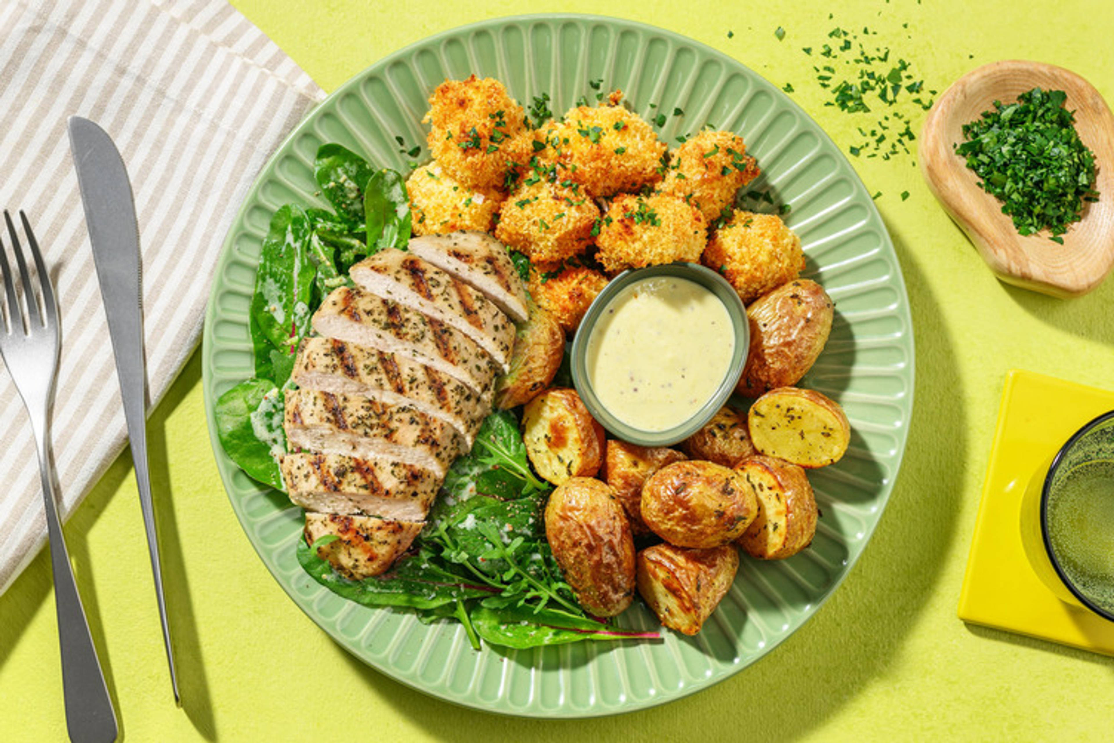 In einem hohen Rührgefäß 50 ml [75 ml | 100 ml] Wasser*, veganes Knoblauch-Dressing, Brühepulver und restlichen Joghurt verrühren. Mit Salz* und Pfeffer* würzen.