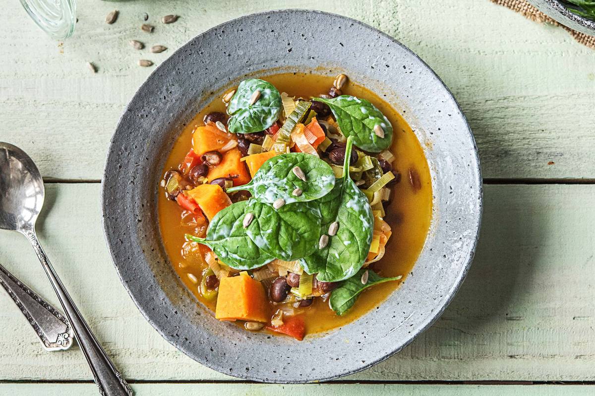 Hmmmm … Der Duft dieses herzhaften Süßkartoffel-Bohnen-Chilis hat in Sekunden alle in unsere Ideenküche gelockt. Die Kombination aus Süßkartoffel, Porree und Jalapeños ist einfach himmlisch und bringt Dir heute die gute Laune direkt in Deine Küche. Abgerundet wird unser scharfes und ballaststoffreiches Power-Gericht mit Popeyes Lieblingsgemüse: Spinat. Nichts wie ran an den Kochlöffel und dann genießen!