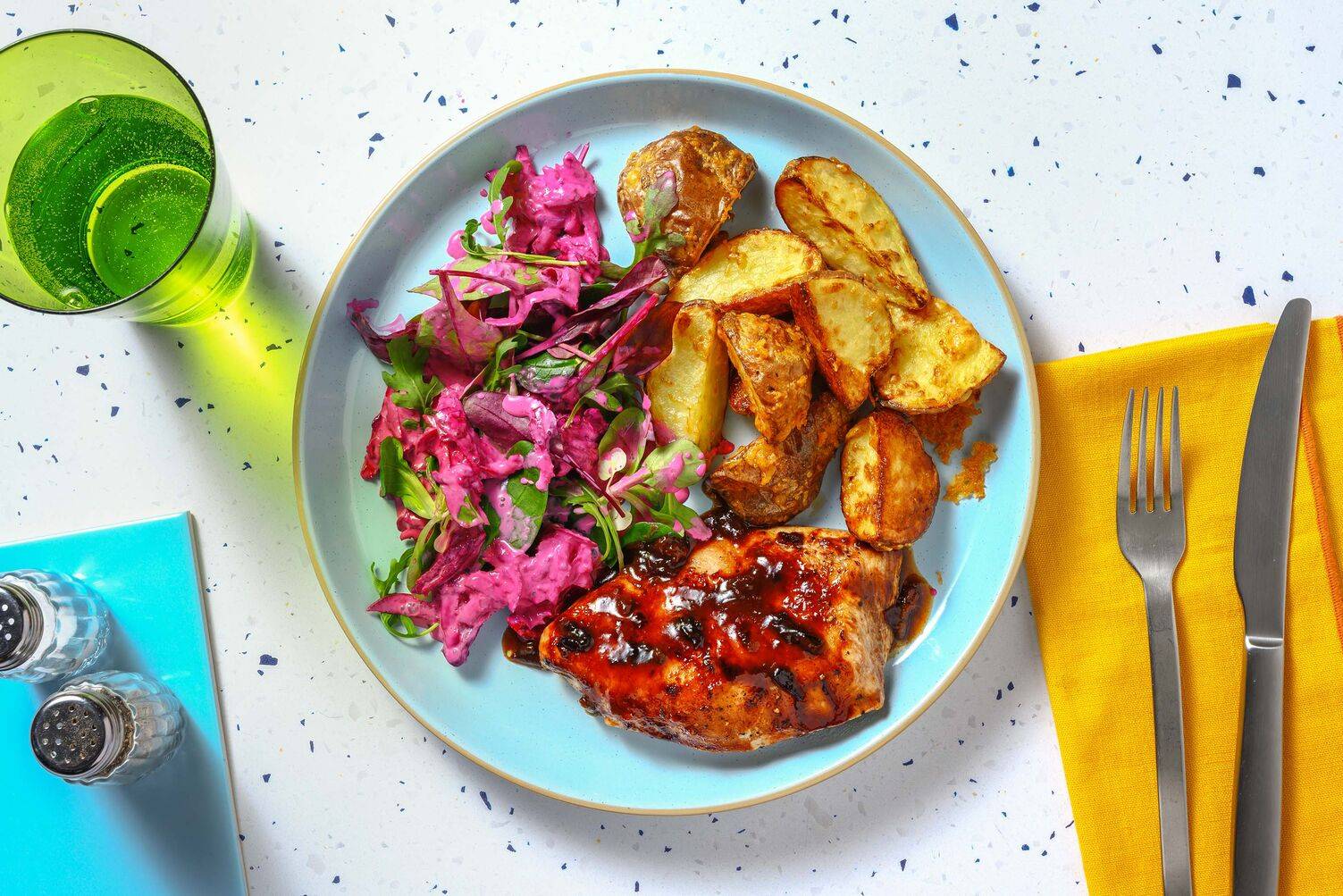 Rippchen auf Teller verteilen. Slaw und Süßkartoffeln daneben anrichten.