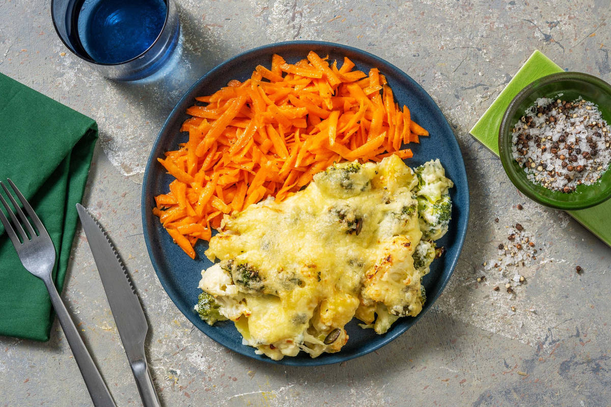 Gemüse mitsamt der Soße in eine große Auflaufform geben. Das Gemüse gleichmäßig mit Bergjausenkäse und Kürbiskernen bestreuen und für 20 – 25 Min. im Ofen backen, bis der Käse geschmolzen ist.