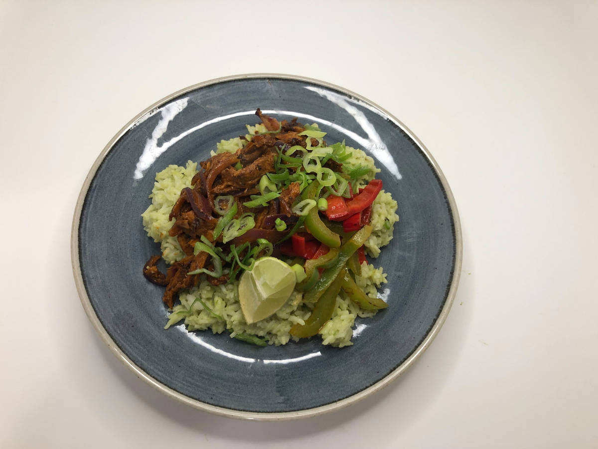 Avocadoreis auf tiefe Teller verteilen, Fajita-Gemüse und veganes Pulled Pork daneben anrichten. Mit grünem Teil der Frühlingszwiebel toppen und restlichen Limettenspalten dazu servieren.